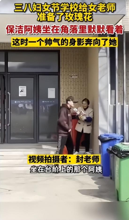 这时,一个身影跑过来,把一束花塞给保洁阿姨:“阿姨,节日快乐!”